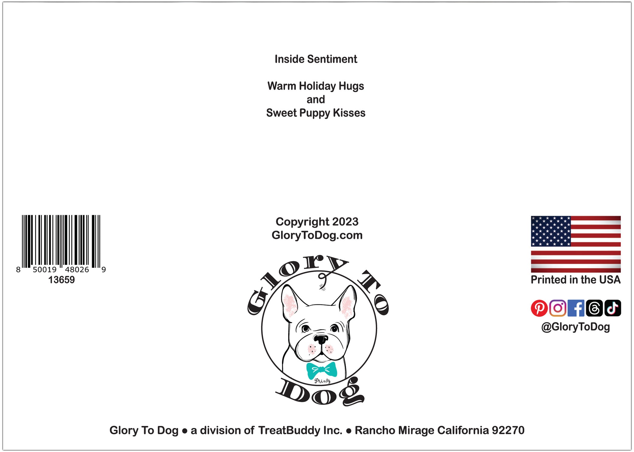 Inside, you’ll find a heartfelt message: “Warm Holiday Hugs and Sweet Puppy Kisses.” Accompanying the message is an adorable illustration of two Dachshunds, cozily curled up in holiday sweaters to form a festive wreath. This thoughtful combination of words and imagery adds a special touch, making this card the perfect way to share love, laughter, and holiday cheer with friends and family.