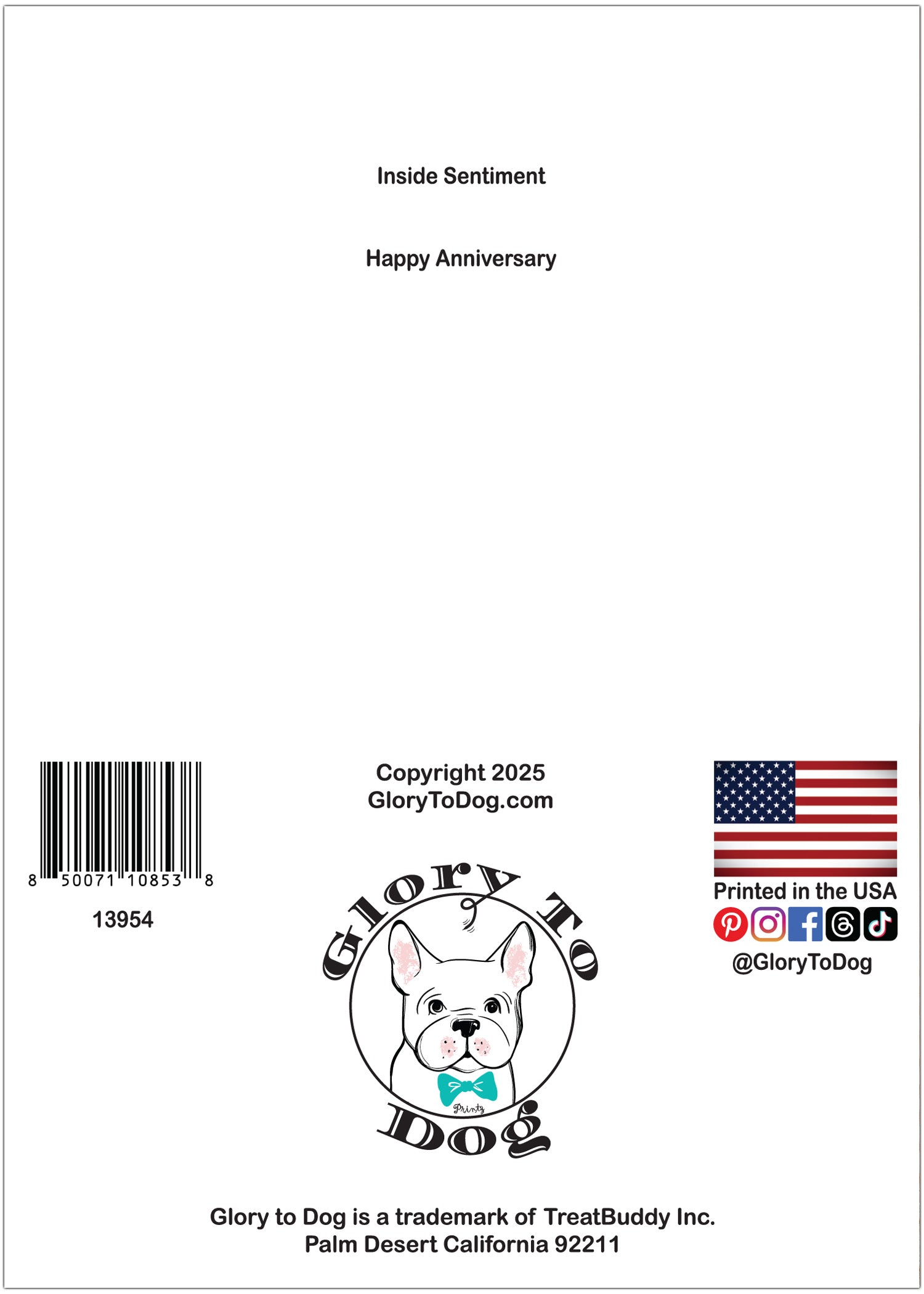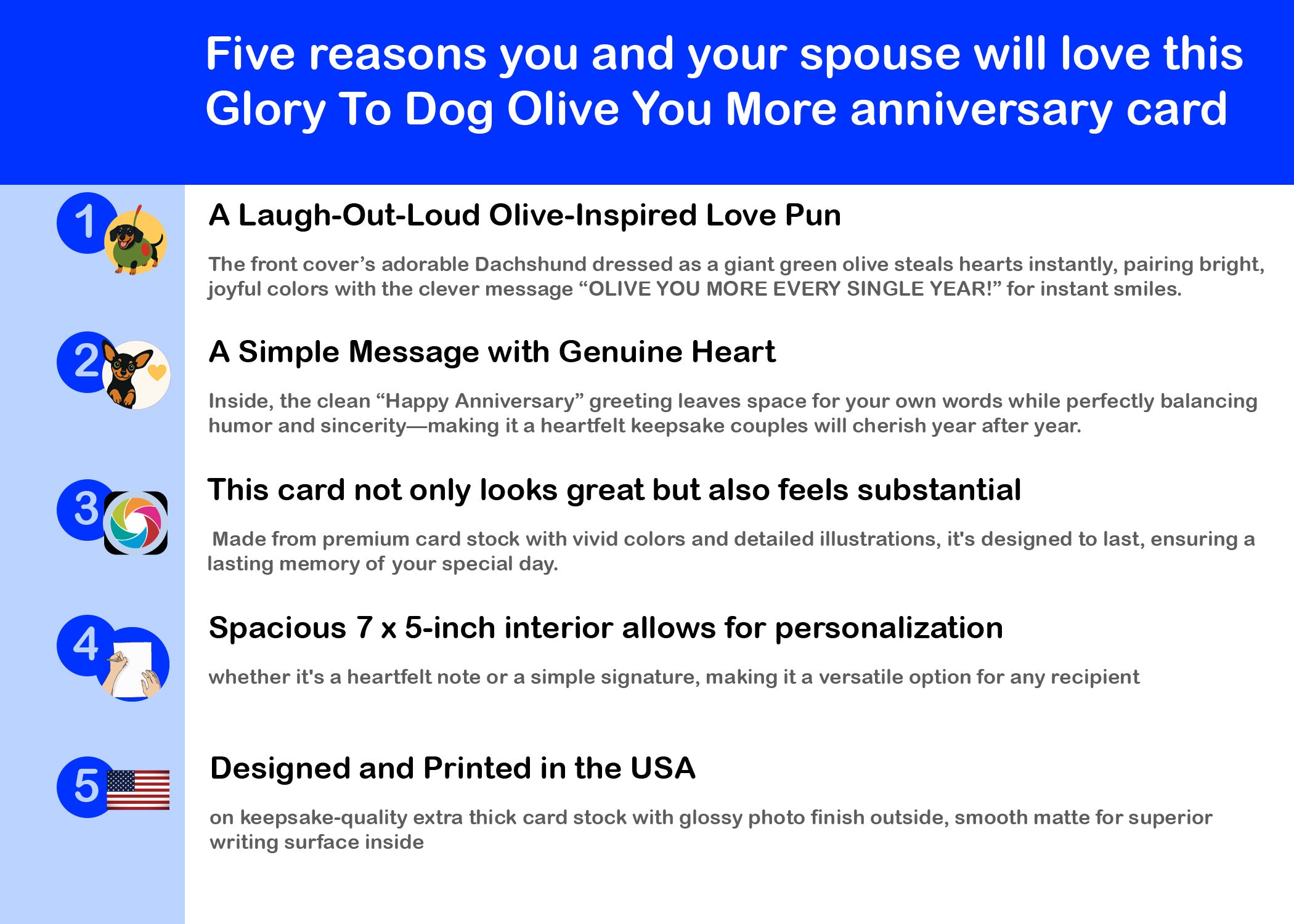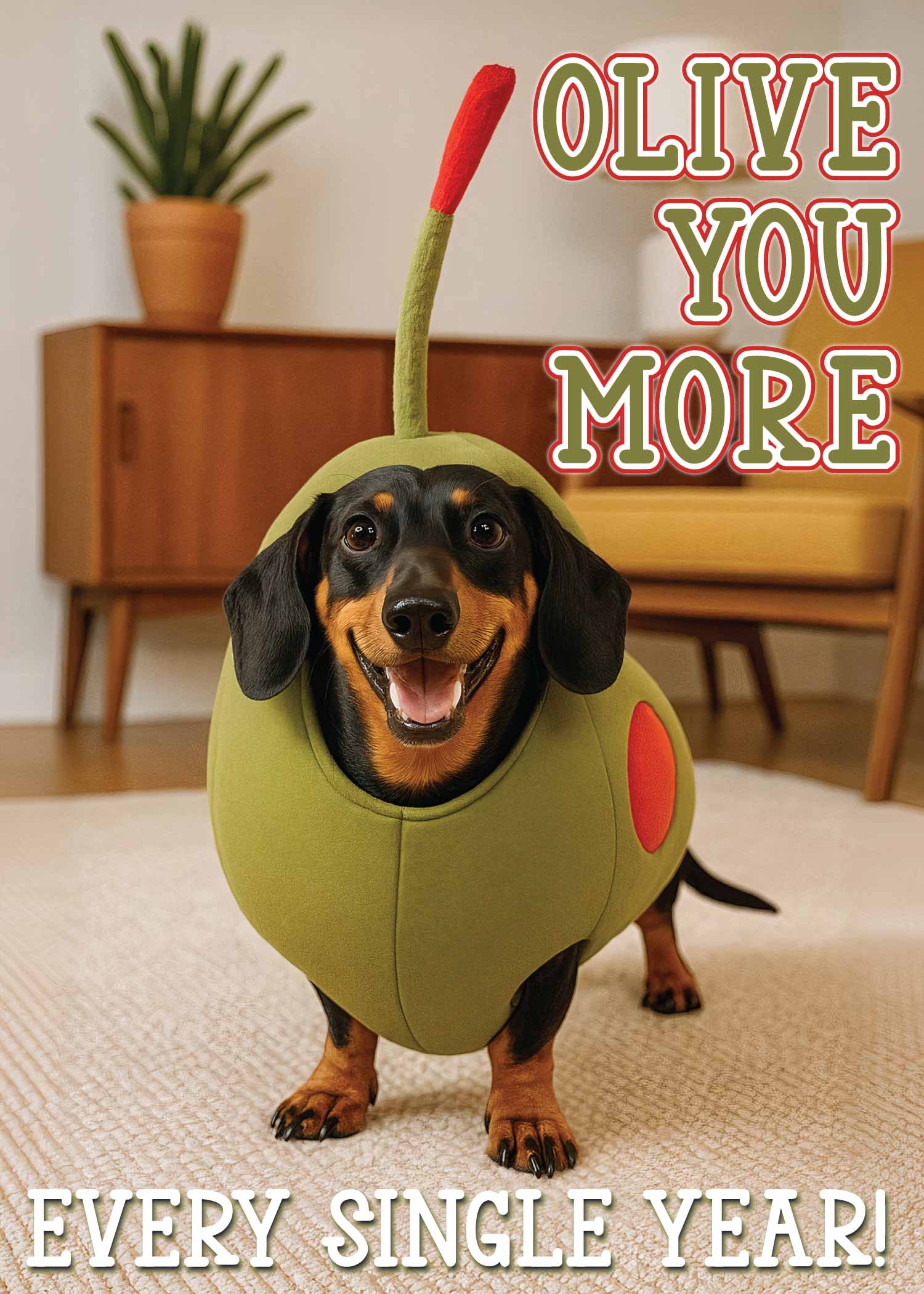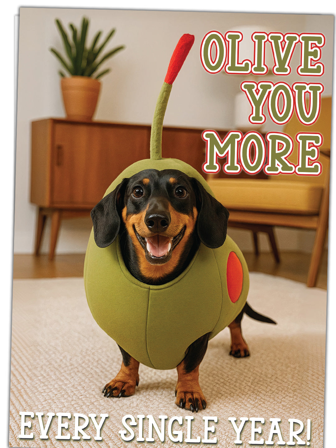 Celebrate another year of love, laughter, and dog-gone devotion with this irresistibly funny and heartfelt anniversary card. The cover features an adorable Dachshund proudly dressed as a giant green olive—complete with a red pimento and a beaming smile—next to the playful message, “OLIVE YOU MORE EVERY SINGLE YEAR!” Inside, the simple yet sincere “Happy Anniversary” greeting lets your words shine, striking the perfect balance between humor and heart. Whether it’s for your partner, a fellow dog lover, or that couple who can’t stop talking about their pup, this card delivers the ultimate mix of charm and cheer. From its clever pun to its joyful spirit, it’s a sweet reminder that love only grows stronger (and sillier) every year—especially when shared with the dog who started it all.