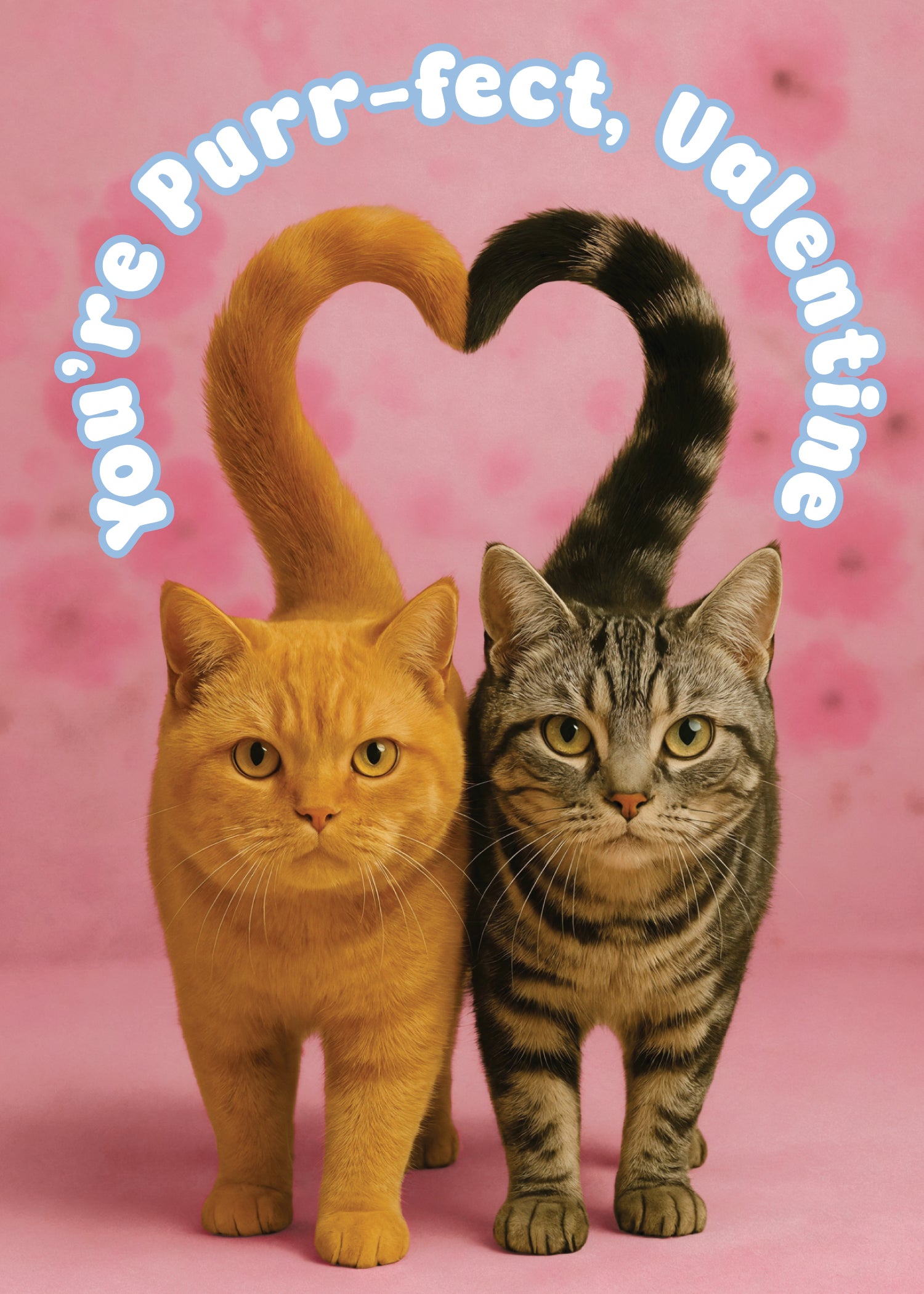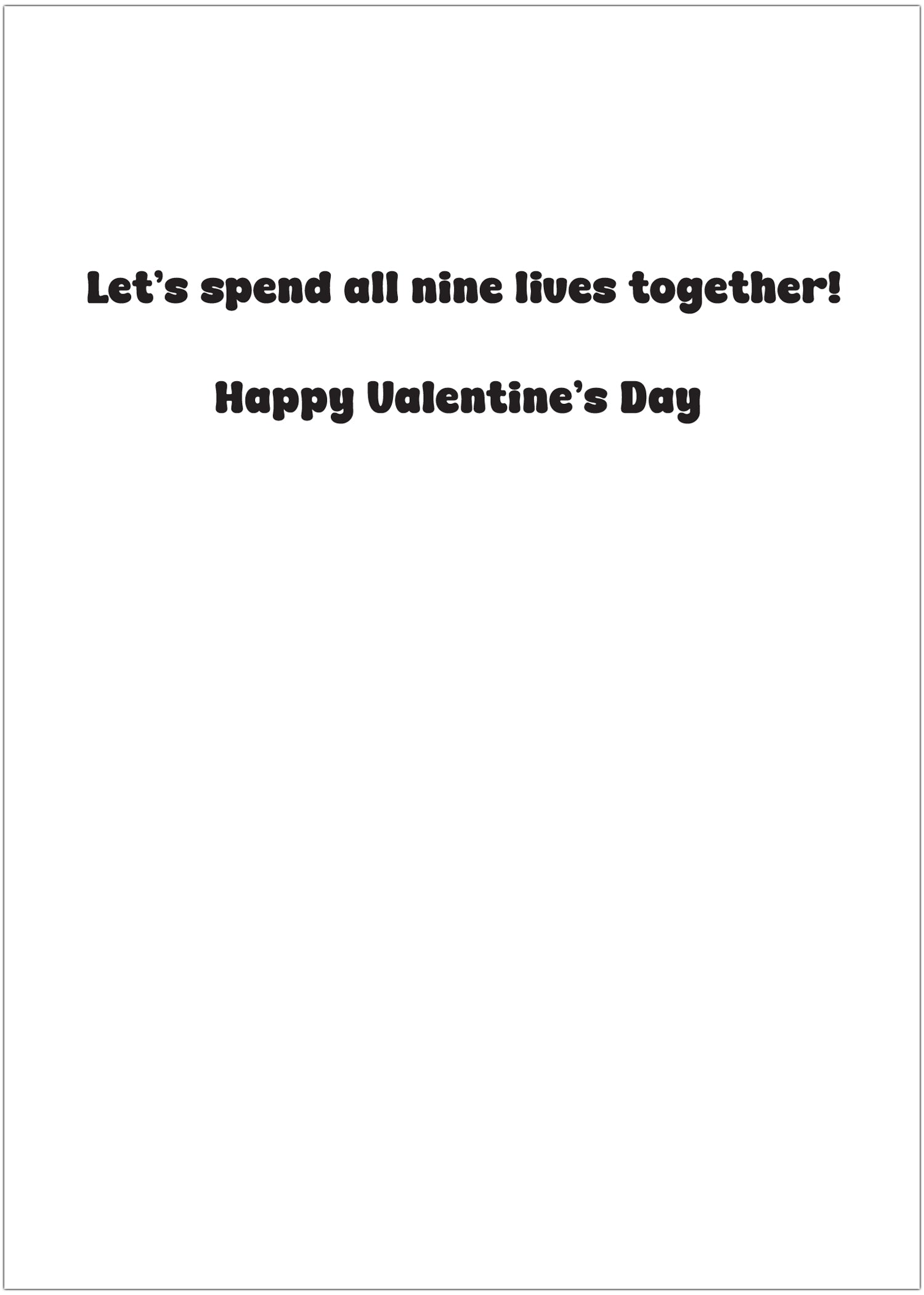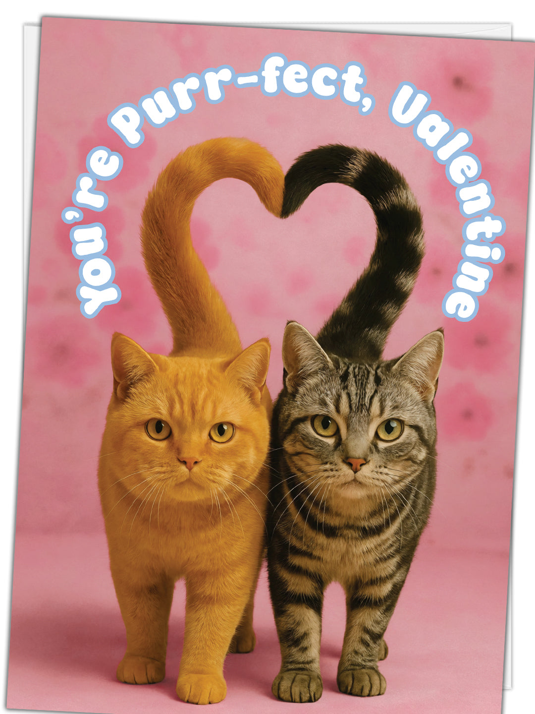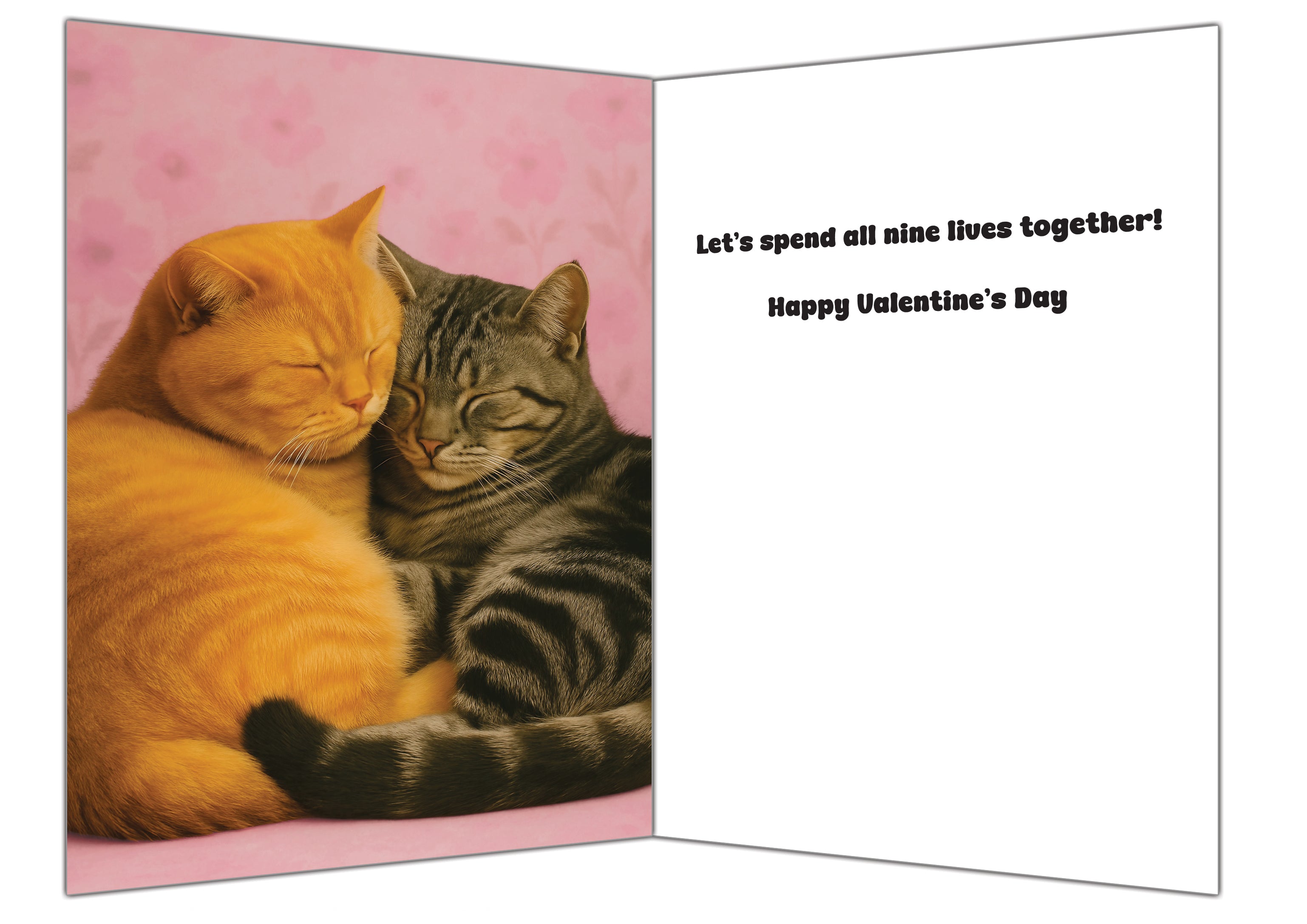 Celebrate love in its most adorable form with this funny and heartfelt cat Valentine’s Day card. The cover features two charming cats standing side by side, their tails curling together to form a perfect heart, paired with the playful phrase “You’re Purr-fect, Valentine.” It’s an instant smile-maker that blends visual wit with genuine affection—ideal for cat lovers who appreciate humor with heart. Inside, the cozy image of the two cats snuggled together deepens the sentiment, reinforcing togetherness, comfort, and lasting love. The message “Let’s spend all nine lives together! Happy Valentine’s Day” strikes a warm, sincere note that feels romantic without being over-the-top. Whether given to a partner, spouse, or someone who simply feels like home, this card delivers a sweet reminder that love is about closeness, companionship, and choosing each other every day—wrapped in a delightfully feline way.