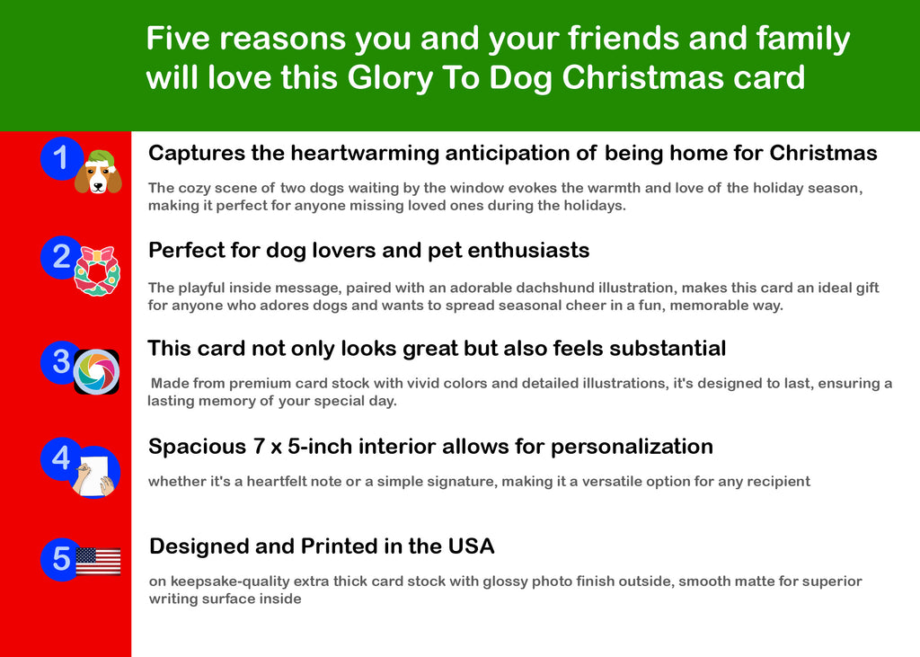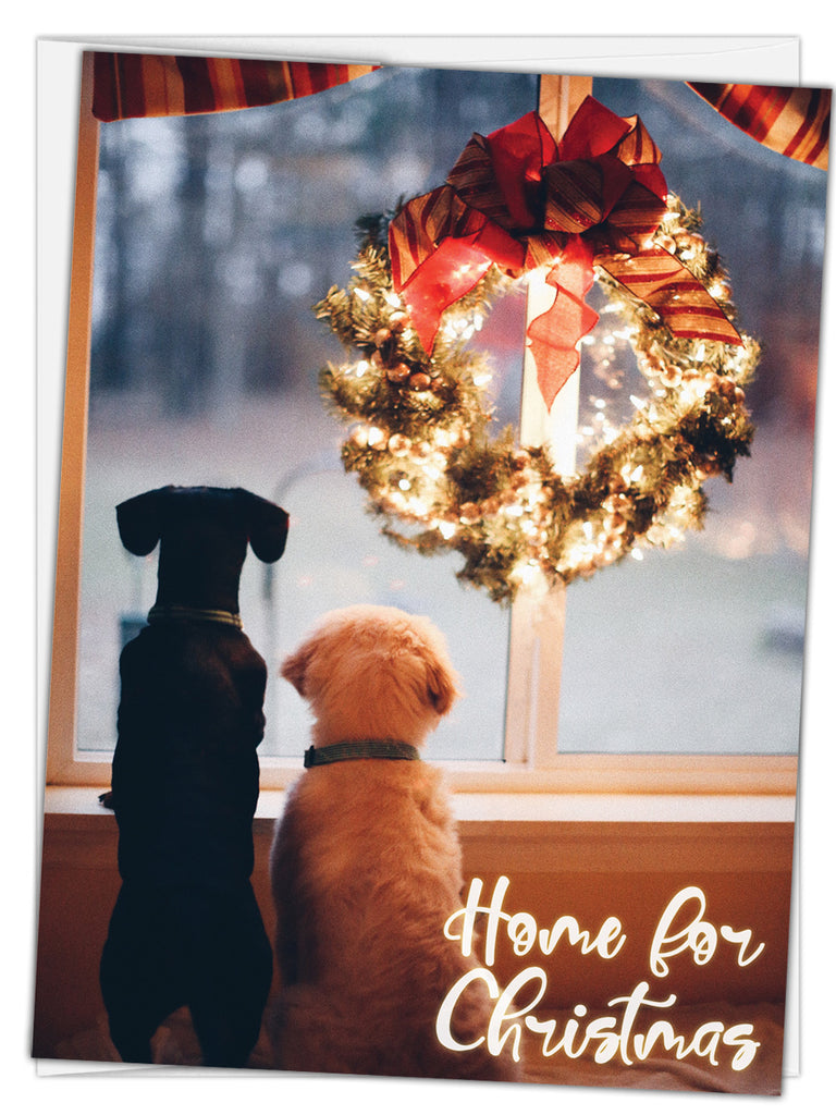 Celebrate the warmth of the season with this heartwarming Christmas card, featuring a Dachshund and a Golden Retriever patiently awaiting, sit side by side, gazing out a festive window adorned with an illuminated wreath. The dogs' posture and the warm glow of Christmas lights evoke the feeling of waiting for someone special to come home. This touching scene captures the essence of holiday anticipation, bringing a sense of coziness and togetherness that will resonate with any animal lover.