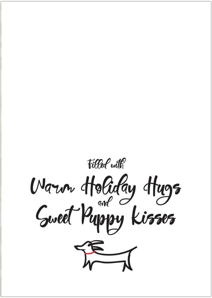 Inside, the message reads, "Filled with Warm Holiday Hugs and Sweet Puppy Kisses," accompanied by a simple yet charming illustration of a dachshund wearing a Santa hat. This heartwarming sentiment reflects the love and joy that pets bring to the holiday season, making this card perfect for anyone who values the warmth of home, family, and tradition. It’s a delightful way to share festive greetings with friends and loved ones.
