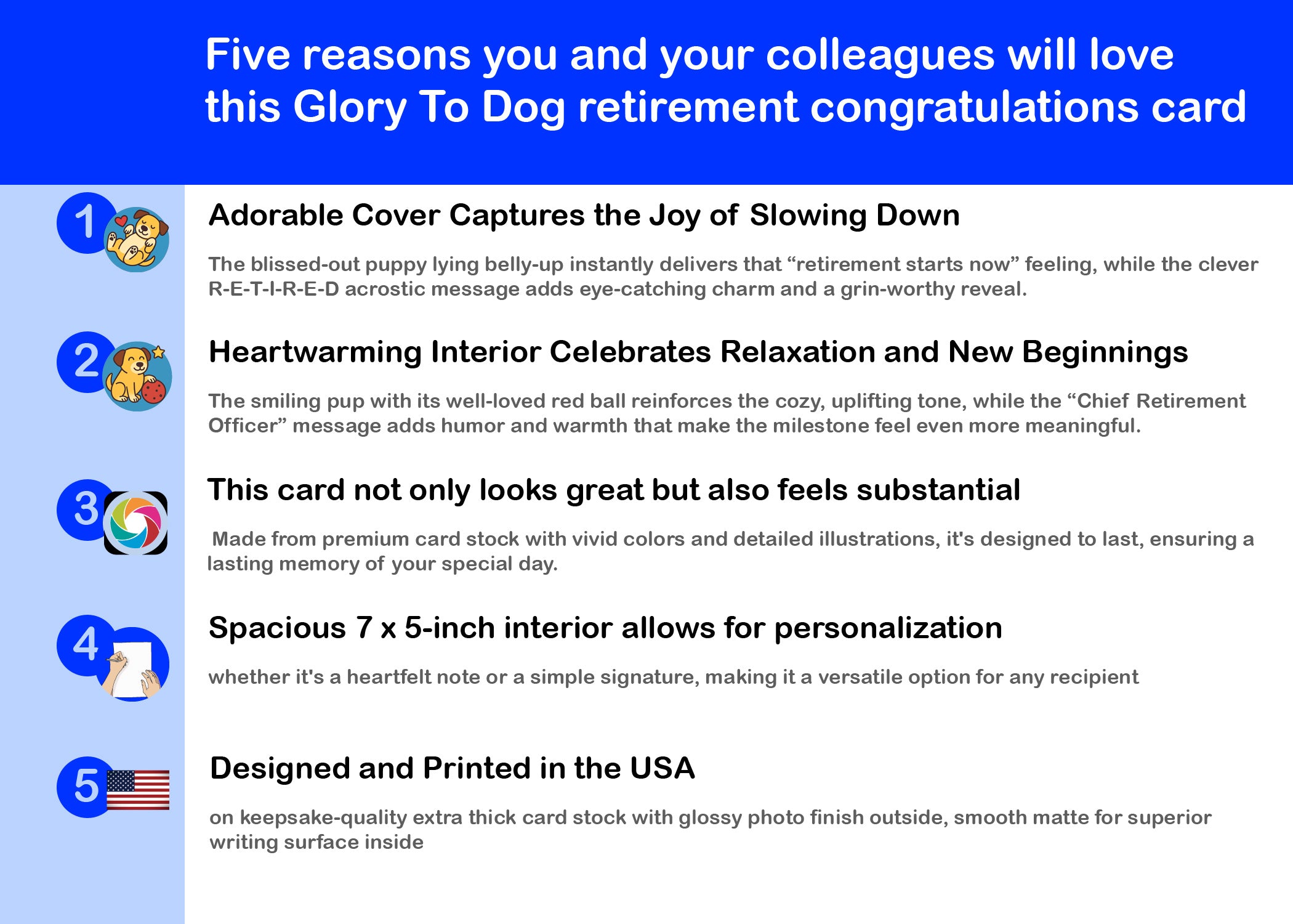 Celebrate retirement with a card that perfectly captures the joy of finally slowing down. The cover features an irresistibly relaxed pup stretched out without a care in the world—an instant mood-setter for anyone dreaming of easy mornings and stress-free days. The playful acrostic message spells out R-E-T-I-R-E-D with a wink, encouraging the new retiree to “Relax Everyday, Take It Really Easy, and Do Nothing!” Inside, the cheerful puppy reappears, happily lounging with a well-loved ball, delivering a warm reminder that doing nothing is a deeply underrated skill. The interior message gently nudges them to embrace their new role as “Chief Retirement Officer,” with a vibe that’s encouraging, humorous, and genuinely heartfelt. Whether you’re celebrating a coworker, friend, or family member, this card blends sweetness and humor into a memorable keepsake that honors the milestone while lifting spirits and sparking a smile.
