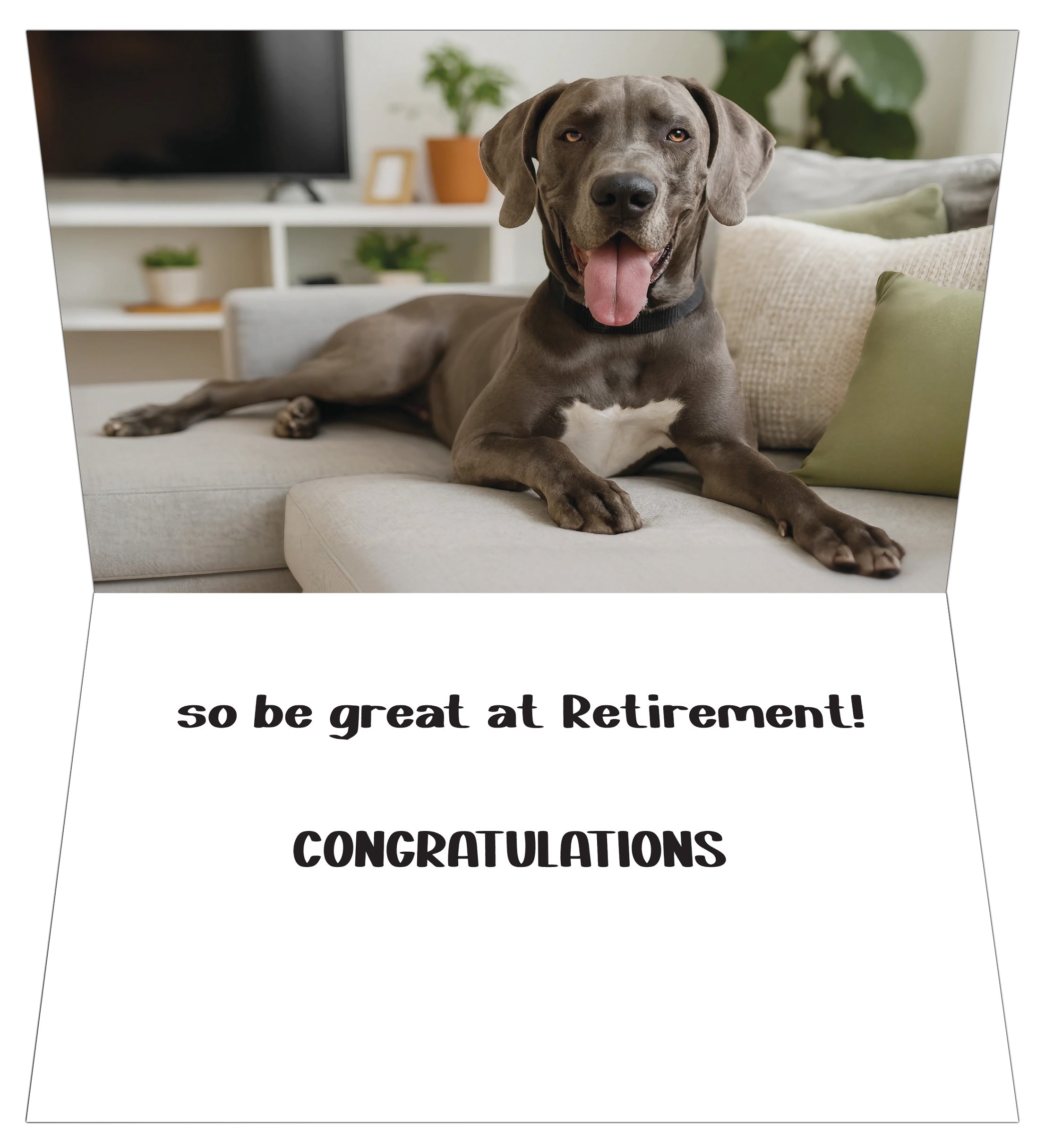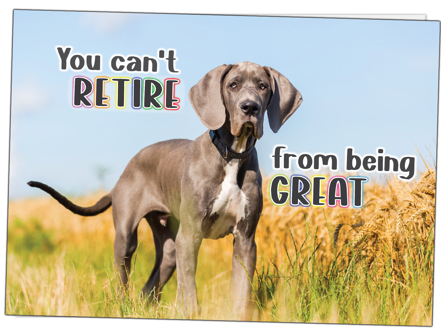 Retirement is the moment to stretch out, breathe deep, and smile wide—just like the confident Great Dane featured on this heartwarming card. With the cheerful message, “You can’t RETIRE from being GREAT,” the cover celebrates that while jobs end, greatness never does. Inside, the relaxed, smiling dog reminds the new retiree to embrace their next chapter with the same grace and enthusiasm they brought to every challenge. The playful line “so be great at Retirement!” and a bold “CONGRATULATIONS” make this the perfect mix of humor, admiration, and sincerity. It’s ideal for coworkers, friends, or family members who’ve made a lasting impact and now get to enjoy well-deserved rest. Whether they plan to travel, nap, or chase new dreams, this card honors their achievements and encourages them to savor every moment ahead—with tail-wagging pride.