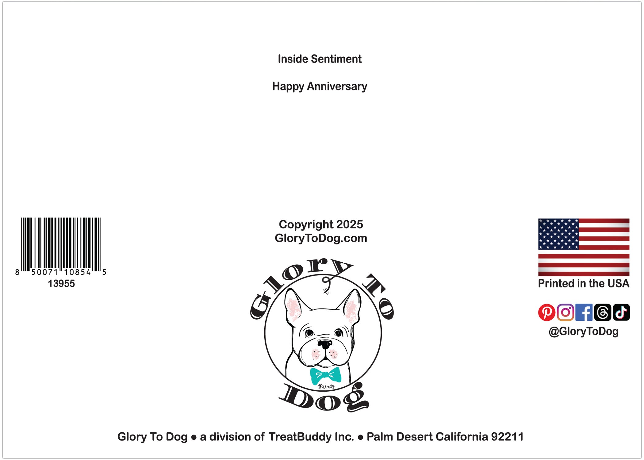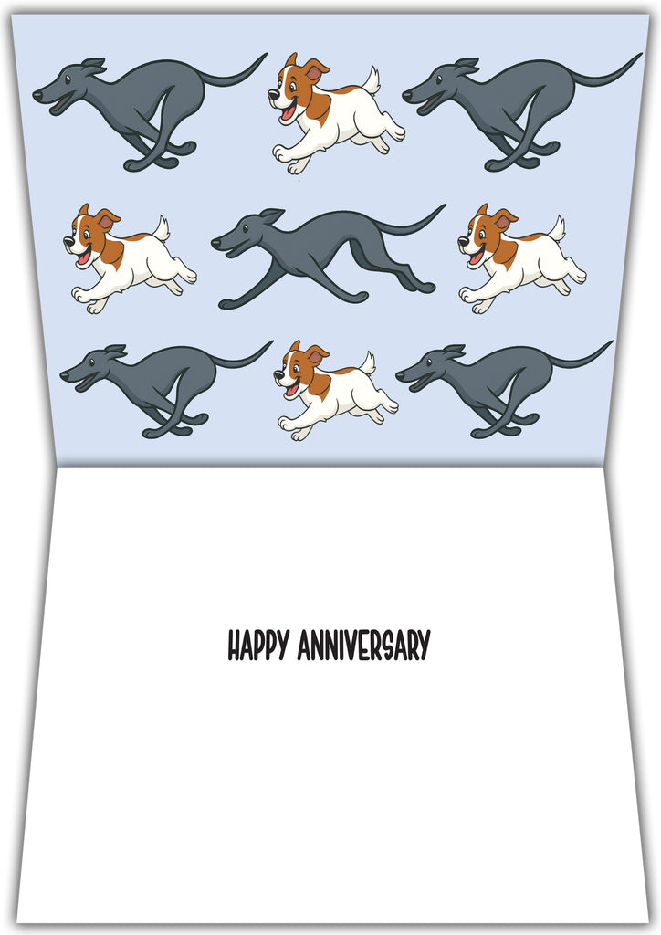 Celebrate love at full speed with this playful Glory To Dog anniversary card featuring two happy pups racing across a grassy field. The photo captures a joyful Jack Russell and sleek greyhound mid-zoomie—an energetic symbol of excitement, connection, and the thrill of being together. The caption, “You make my heart race faster than zoomies,” pairs humor with heartfelt emotion, perfectly balancing laughter and affection. Inside, a charming pattern of running dogs and the simple message “Happy Anniversary” carry the theme forward with warmth and sincerity. Whether it’s for your partner, spouse, or another dog-loving couple, this card delivers smiles, love, and wagging-tail energy in equal measure. It’s a fun, lighthearted way to say, “You still make my heart race.”